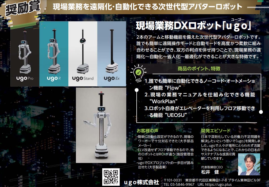 「東京都ベンチャー技術大賞」は、 都内の中小企業がその技術力を活かして開発した革新的で将来性ある製品・技術、サービスを表彰するもので、数多あるベンチャー企業の中から当社の現場業務DXロボット「ugo」が選出されました。